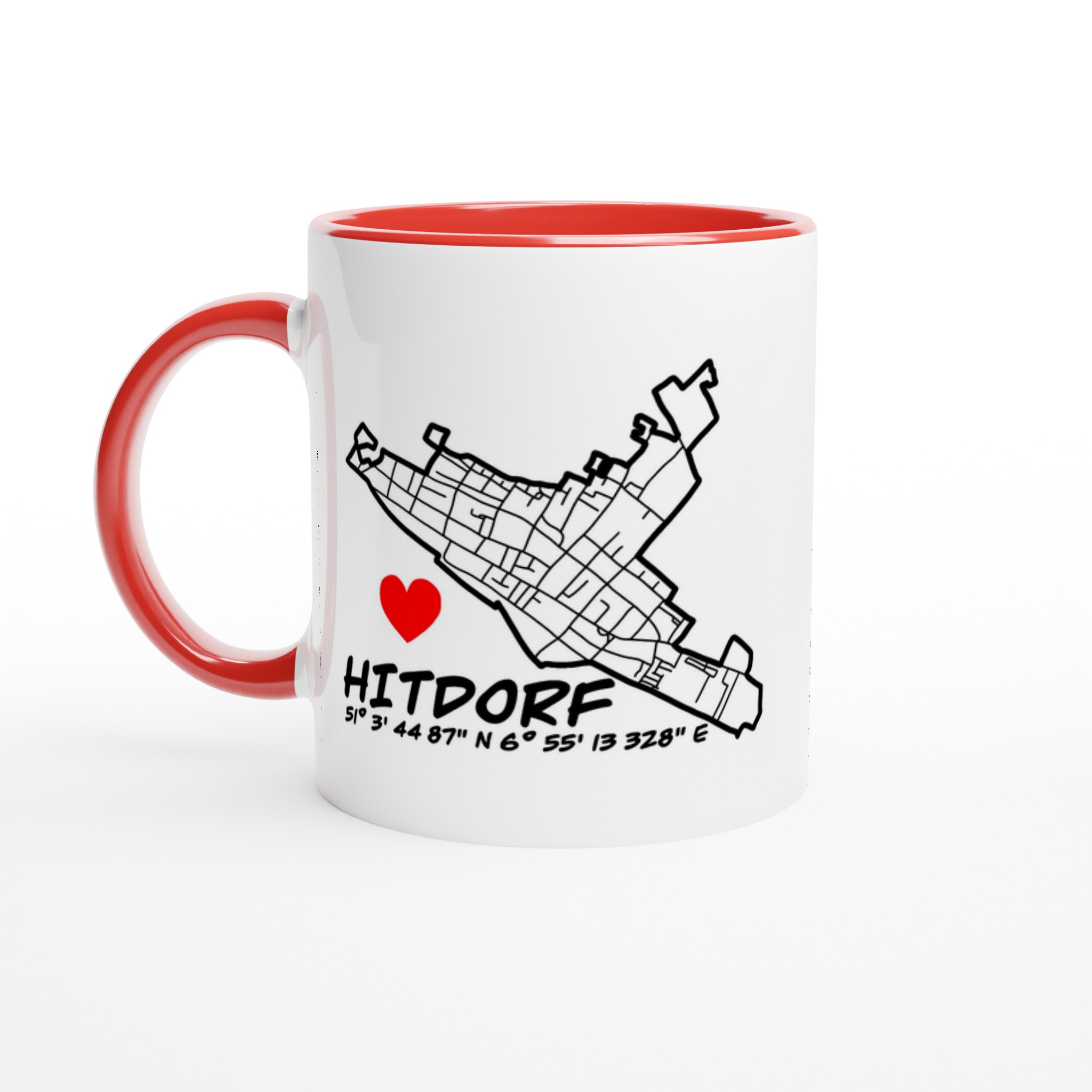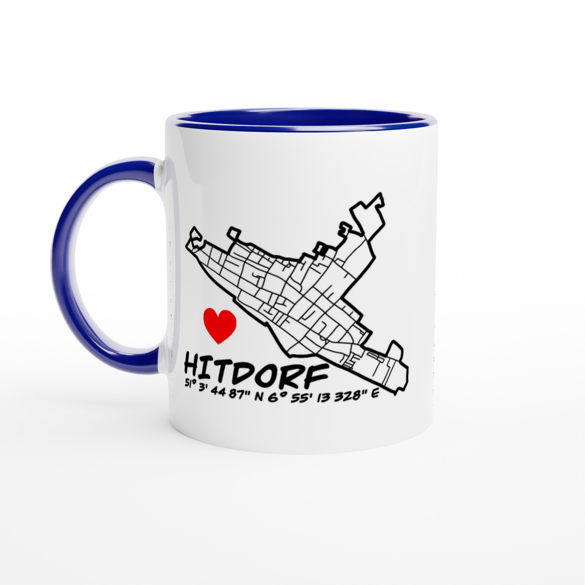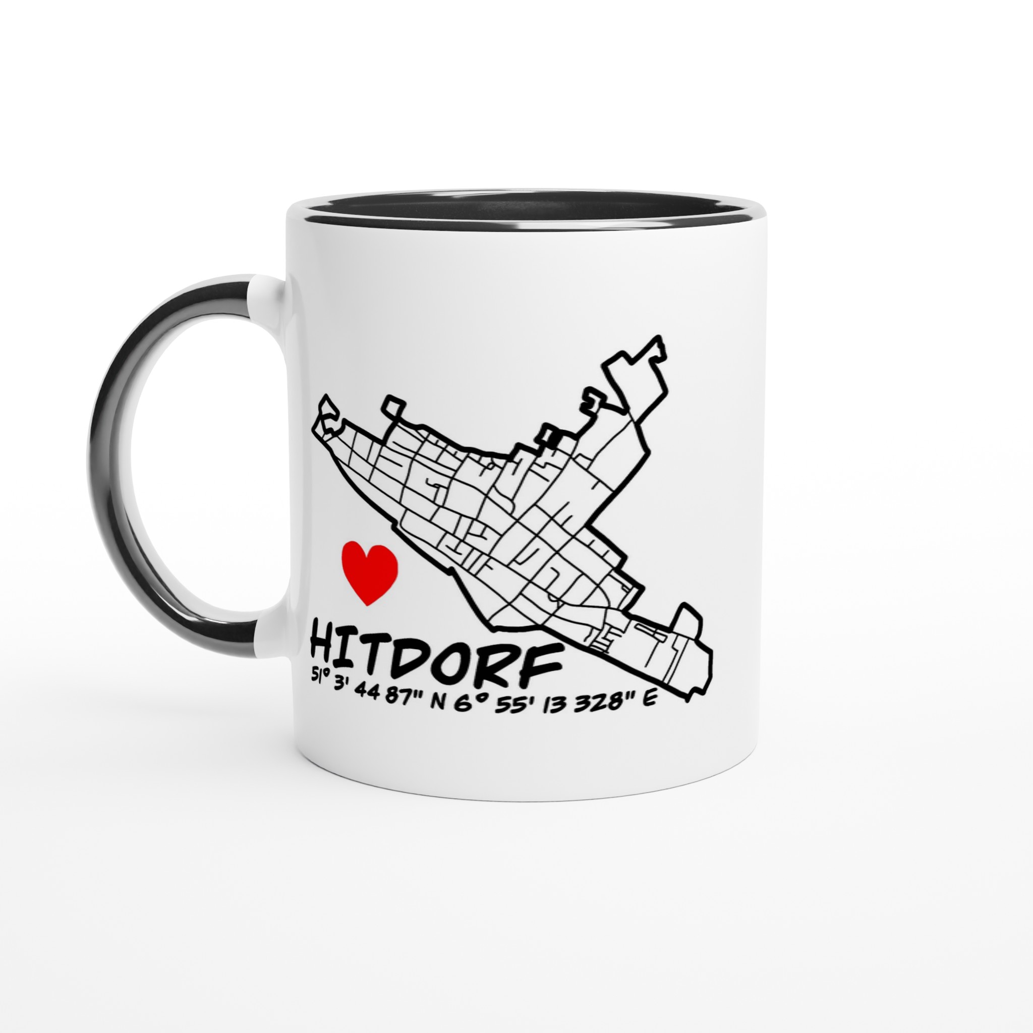 Diese besondere Keramiktasse verbindet Heimatliebe mit modernem Design. Das detailreiche Straßennetz von Hitdorf in Kombination mit den GPS-Koordinaten, dem Schriftzug „Hitdorf“ und dem roten Herz macht sie zu einem echten Blickfang – persönlich, stilvoll und voller Bedeutung.