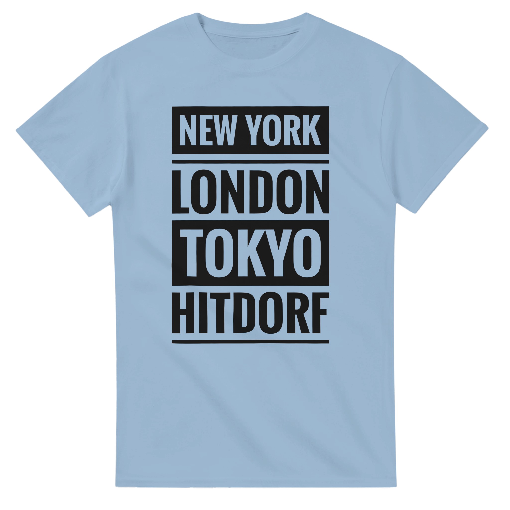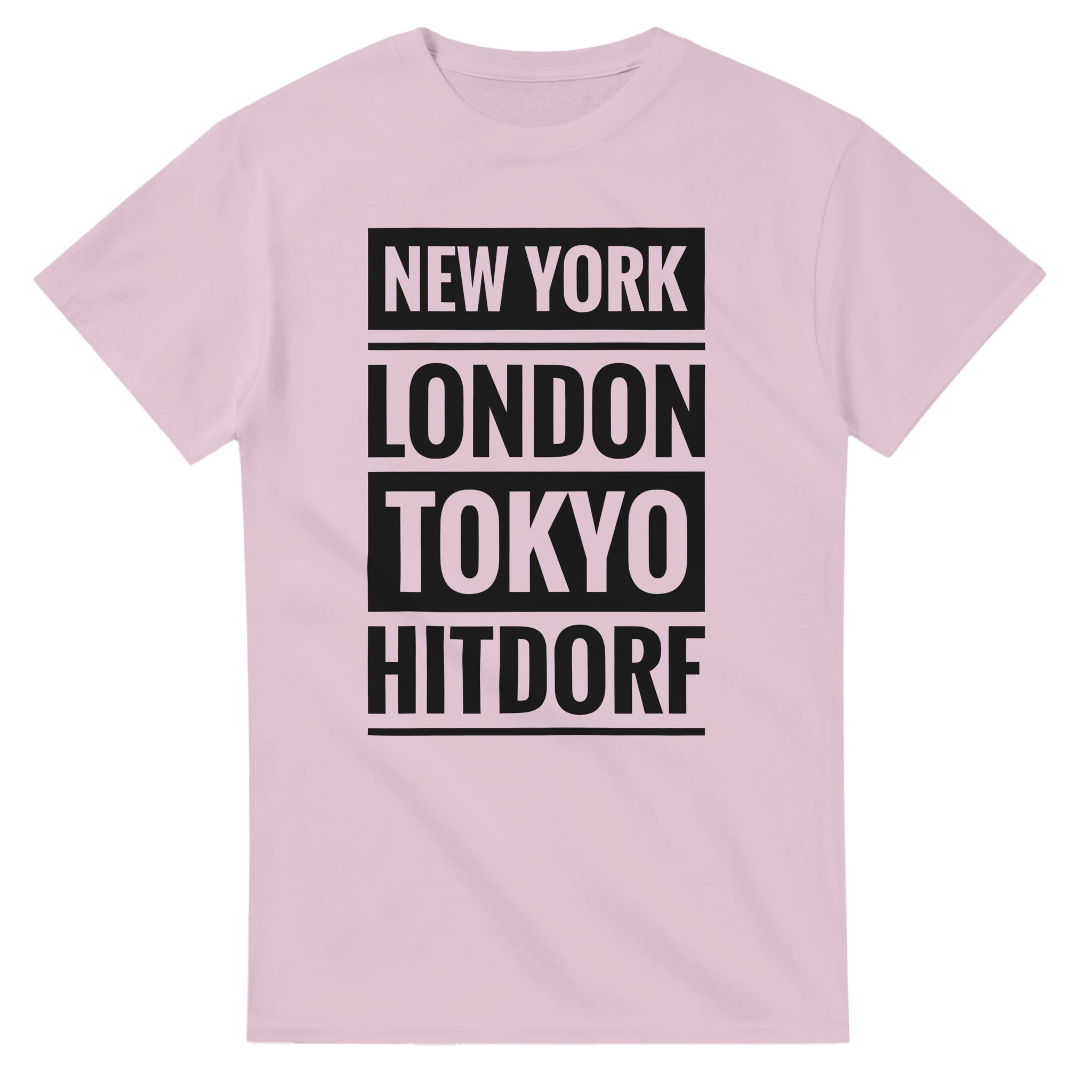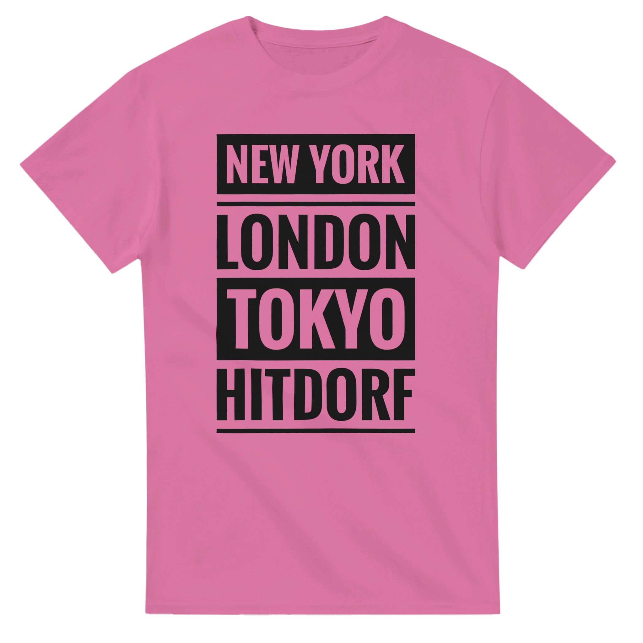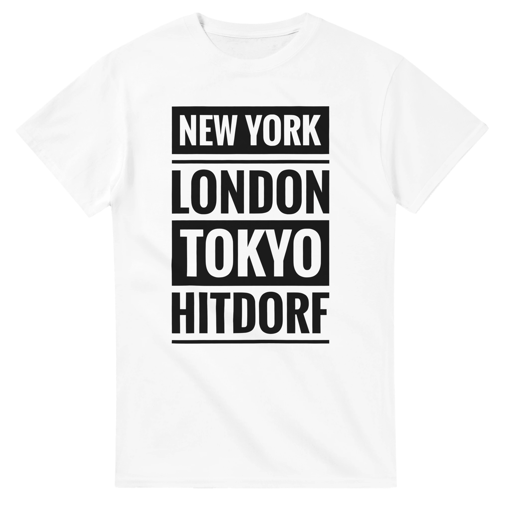 Dieses T-Shirt verbindet große Metropolen mit einem ganz besonderen Ort: Hitdorf. Der Schriftzug „New York / London / Tokyo / Hitdorf“ in klarer Blockschrift untereinander macht das Shirt zu einem coolen Statement für Heimatliebe mit urbanem Flair. Zeige, dass Hitdorf für dich genauso wichtig ist wie die bekanntesten Städte der Welt – lässig, selbstbewusst und modern.