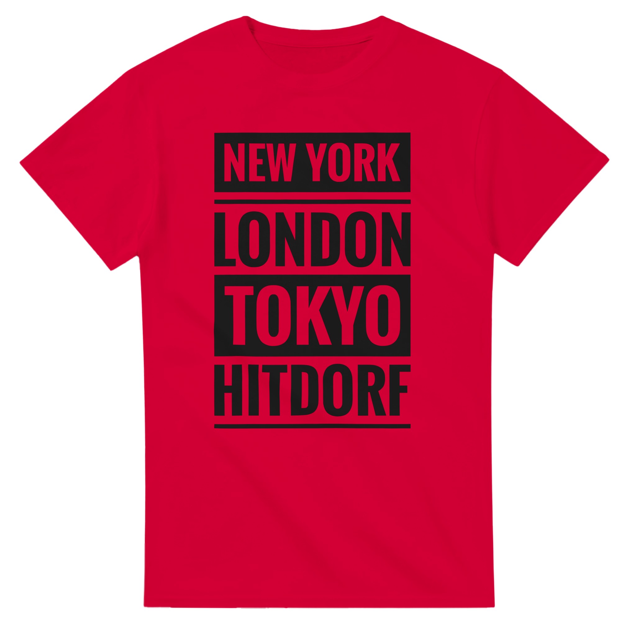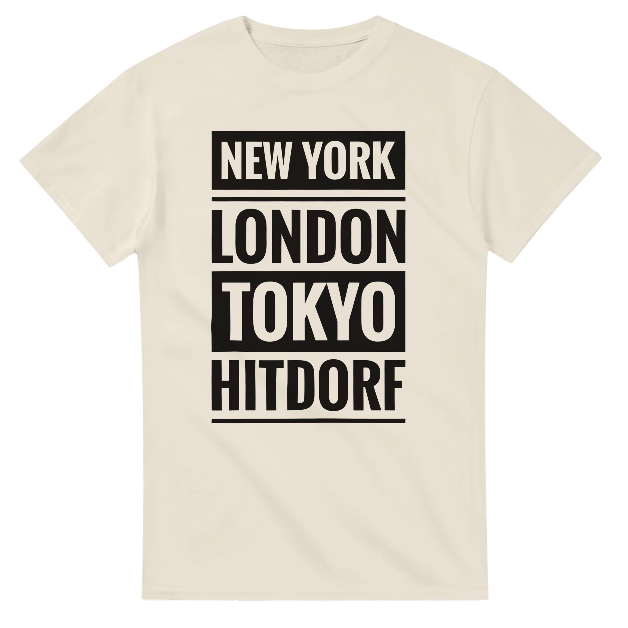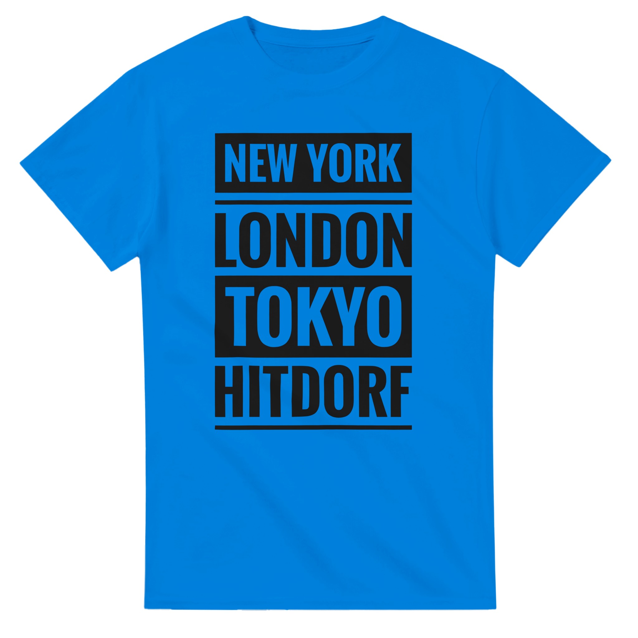 Dieses T-Shirt verbindet große Metropolen mit einem ganz besonderen Ort: Hitdorf. Der Schriftzug „New York / London / Tokyo / Hitdorf“ in klarer Blockschrift untereinander macht das Shirt zu einem coolen Statement für Heimatliebe mit urbanem Flair. Zeige, dass Hitdorf für dich genauso wichtig ist wie die bekanntesten Städte der Welt – lässig, selbstbewusst und modern.
